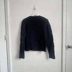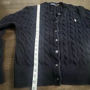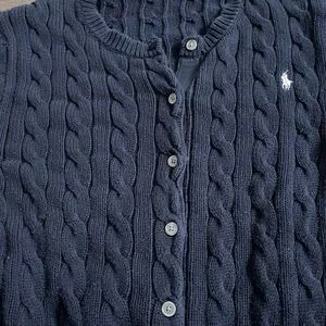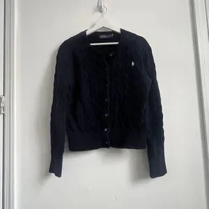 This product is a stylish Polo Ralph Lauren women's cable-knit cotton crewneck cardigan in a classic blue color, perfect for fall, winter, and spring seasons. The cardigan features a solid pattern, long sleeves, and a crew neck neckline, making it suitable for casual, business, or workwear occasions. Made from high-quality cotton with a cable-knit style, this cardigan exudes a timeless preppy and classic vibe that is ideal for school or college settings. The signature Ralph Lauren logo accents the design, adding a touch of sophistication to your look.