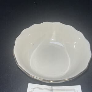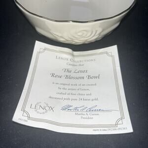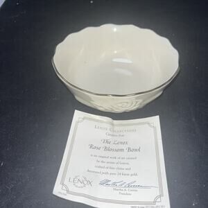 The Lennox Rose Blossom Bowl with 24K gold trim is a vintage piece from the 1980s, featuring a classic rose pattern on cream porcelain. This elegant bowl, measuring 5 1/2" x 2", is perfect for all occasions and has a mid-century modern style. With its luxurious gold edge detailing and vintage charm, this bowl is a beautiful addition to any collection or table setting. The Lennox Rose Blossom Bowl is a timeless and sophisticated piece that exudes quality and craftsmanship.