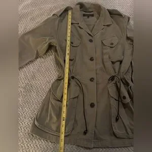 Khaki military-style jacket with button closures. Features multiple pockets and adjustable waist. Ideal for layering.