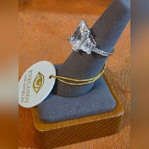 This stunning silver ring features a large clear gemstone, perfect for adding a touch of elegance to any outfit. The sparkling design is ideal for special occasions or everyday wear.
