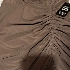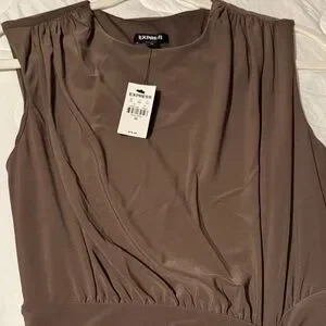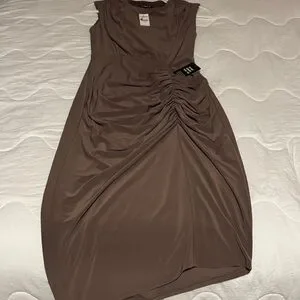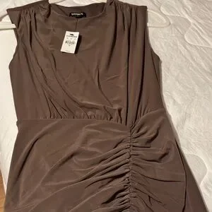 Chic brown midi dress with ruched detailing. Sleeveless design. Perfect for versatile styling.