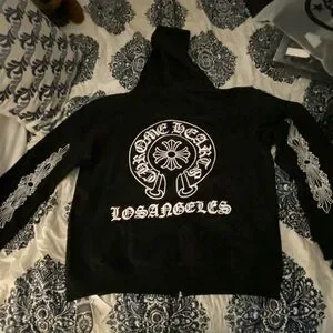 Stylish Chrome Hearts hoodie. Black with white graphic designs. Features front zipper and hood.