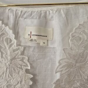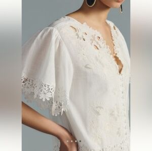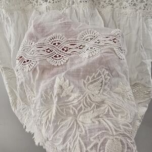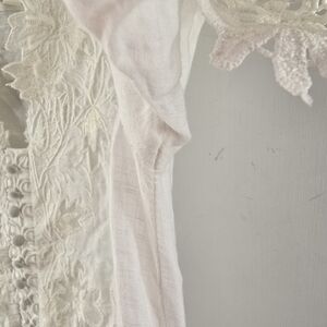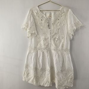 In like-new condition, this lightweight and breezy short flutter flare full scalloped scallop floral flower applique sleeve sleeved sleeves relaxed boxy embroidery adorned dress is the epitome of bohemian chic. Split plunge vneck v neck v-neck neckline. Popover pullover style. Unlined. Sheer Cutout elements / panels. Front center fabric covered button aesthetic detsils give a corseted corset look and feel. 100% cotton. Inner snaps keeps bra straps firmly in place and secure. Extra spare replacement button secured to fabric care tag.