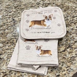 Enhance your kitchen with this charming Corgi design linen set. Featuring delightful cream and brown tones, it's perfect for dog enthusiasts.