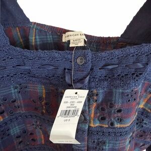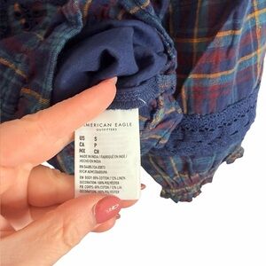 American Eagle Blue Plaid Crochet Lace Puff-Sleeve Blouse Women’s Sz Small NWT