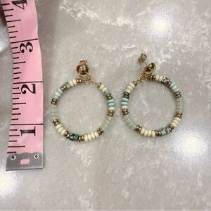 Description: Fun LOFT “Getaway” beaded hoop earrings in soft pastel tones—creamy white, turquoise, jade green marbled beads, and shiny gold-tone spacers. Each hoop has a dangling gold bell charm for extra movement and shine. Gold-tone post backs. New with tags (NWT), original retail $34.50, still in the original plastic sleeve with LOFT label. Approx. 2” diameter (lightweight and comfortable). Perfect everyday or vacation accessory. From a smoke-free, pet-free home. Bundle for discounts!