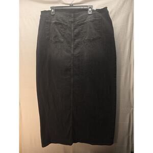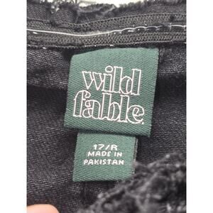 This is a Wild Fable black denim skirt in size 17 with a middle open slit. It has a Y2K grunge style and features a frayed design. The skirt is made of a cotton blend fabric, suitable for casual wear or travel. It has a hook & eye closure and falls at a midi length. Ideal for winter, summer, fall, and spring seasons, this A-line skirt is machine washable and not personalized.