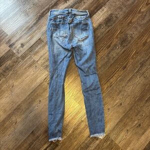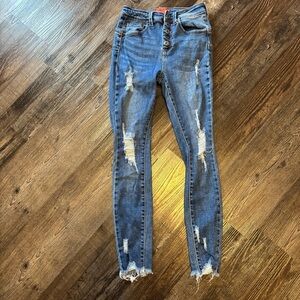 These Wax Jean skinny jeans feature a striking distressed design with a light to medium blue wash. The denim showcases heavy distressing at the knees and thighs, complemented by a frayed, raw hem for a trendy, worn-in look. Crafted with a hint of stretch, they offer a comfortable, fitted silhouette perfect for a casual, stylish ensemble.