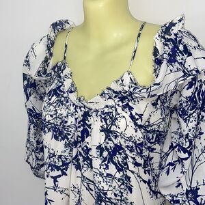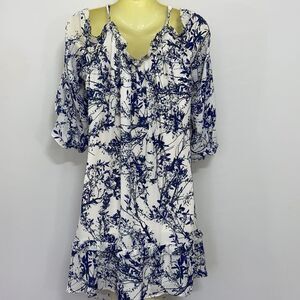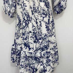 BY PARKER, HERE IS A FABULOUS MINI DRESS THAT IS PERFECT FOR LUNCH TO DINNER. CALLED "WHITE THICKET" IT IS 100% POLY AND FULLY LINED IN WHITE POLY. THIS DRESS HAS ALL THE BELLS AND WHISTLES. THE PRINT IS A DEEP AND LIGHT BLUE FLORAL OVER WHITE. IT FEATURES RUFFLED COLD SHOULDERS THAT ARE 3/4 LENGTH. THE SHOULDERS HAVE ATTACHED LINGERIE STRAPS. THE COLLAR AND BACK OF THE NECK ARE RUFFLED AND THE HEM IS ACCENTED WITH A RUFFLE.CAN BE WORN AS A MINI DRESS OR A TUNIC! NEW WITH TAG!~EXCELLENT CONDITION! SIZE SMALL, BUT IT IS LOOSING FITTING AND OVERSIZED. PLEASE NOTE THE MEASUREMENTS.