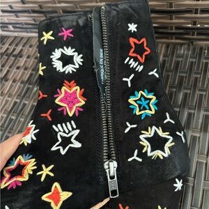 Vibrant embroidery on black suede. Features stars and crescent moon. Unique and stylish design.
