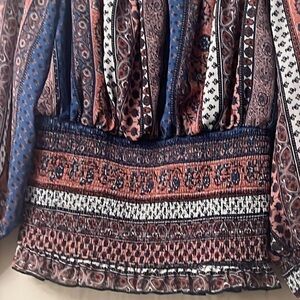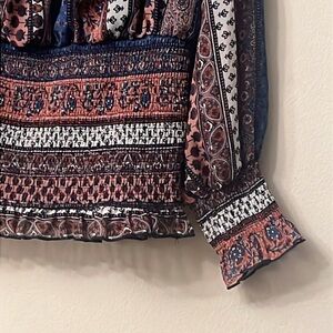 This VENUS blouse features a charming combination of ruffled and smocked details, complemented by 3/4 sleeves for a sophisticated look. The vibrant blue and red hues add a pop of color, making it a versatile addition to any wardrobe.