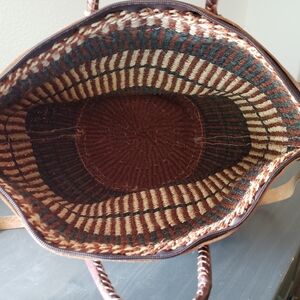 This elegant handcrafted tote bag features a beautiful brown and tan woven with leather handles design.Perfect for any occasion, it combines style and functionality,great condition.