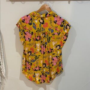 Brighten your wardrobe with this vibrant floral yellow top. Perfect for casual outings, this top offers both style and comfort. please note that one button is missing, but there is a spare button on the tag.