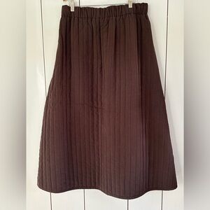 A relaxed, A-line skirt made from a soft textured padded fabric. Features an elasticized waistband and slant side pockets.