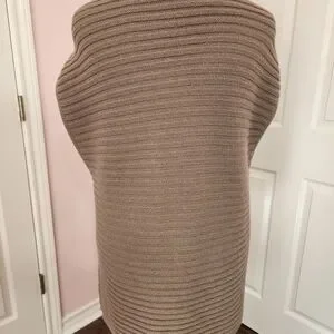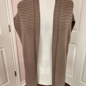 Chic taupe cardigan with ribbed texture. Open-front design. Ideal for layering.