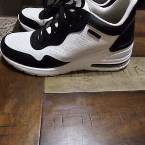 Step out in style with these Skechers women's sneakers. Featuring a sleek black and white design, these shoes offer both comfort and fashion for everyday wear.