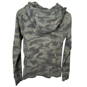 Lululemon Scuba Hoodie Heritage 365 Camo Green Camo Zip Up Light Cotton Fleece Size 4 Athleisure Gym Wear Yoga Jacket Thumbhole Sleeves Ribbed Panels Fall Layering Activewear Women’s Hoodie Casual Street Style Military Camo Neutral Aesthetic