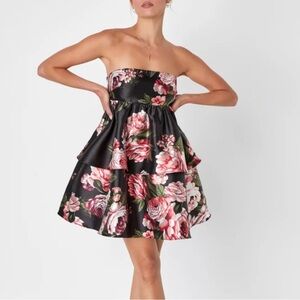 Lulus Charming Intentions Black Floral Taffeta Strapless Mini Dress