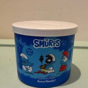 Blue Goose Creek candle with Smurfs design.