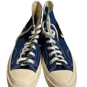 Classic Converse high-tops in blue with white accents. Features white laces, with heart face on the outer side of the shoes , pre-loved in great condition.Men Sz 8 / women Sz 10