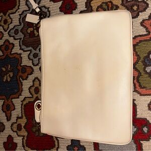 Elevate your style with this chic cream clutch bag featuring a bold red design. Perfect for a night out or a special occasion.