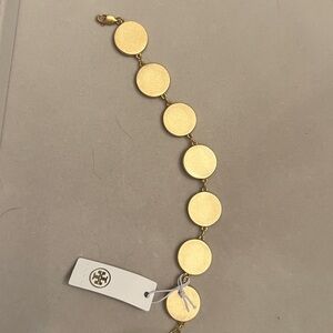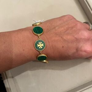 Tory Burch green malachite stone with gold Tory logo. Adjustable up to 9”. Dust bag included. No returns and no international shipping. (It is a matte gold so the back of the bracelet may look “worn” but it’s not - it’s the texture of the metal.)