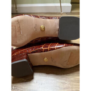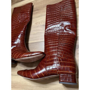 Step out in style with these stunning Veronica Beard knee-high boots featuring a rich brown croc embossed leather design. The pointed toe and block heel add a chic touch, perfect for elevating any outfit. Crafted with high-quality leather, these boots offer both durability and comfort. Ideal for fall and winter, they pair beautifully with dresses, skirts, or skinny jeans. The iconic emblem on the sole adds a signature detail. A must-have luxury addition to your shoe collection! Brand new without tags never worn or handled besides to take pictures.