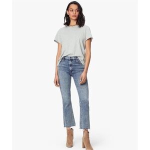 Cult-favorite MOTHER “The Hustler Ankle Fray” flared jeans in the wash Shaking Things Up. High-rise fit with a cropped ankle-length flare and raw frayed hem. Soft, premium stretch denim with subtle fading and whiskering for a worn-in look.