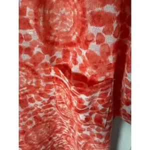 This is a pre-owned, unbranded women's short-sleeve tee featuring an orange and white tie-dye or abstract floral pattern. The shirt has a V-neckline and a single patch pocket on the left chest. The sleeves are cuffed.