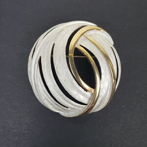Vintage Round Swirl Dome Cutout Silvery White Enamel Gold Tone Metal Brooch Pin
