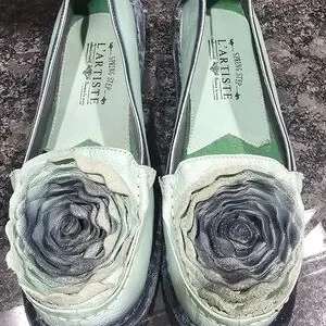 Elegant mint green loafers by L'ATISTE featuring a stunning floral design. Perfect for adding a touch of sophistication to any outfit. Worn once.