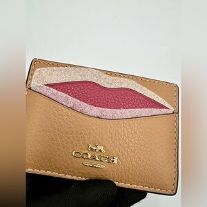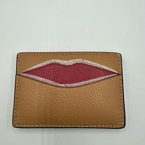 Coach Lip Card Case in Gold/Latte Multi, featuring a slim design with a playful lip-shaped applique and a gold-toned logo.