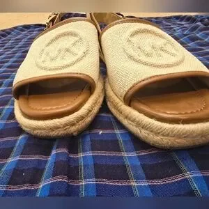 These Michael Kors Royce Slide Sandals in size 7 feature the brand's signature MK logo design in a beige/brown color. The sandals have a solid pattern, buckle closure, and are suitable for various occasions such as travel, parties, casual outings, and formal events. Made with tumble upper material, these slide sandals are perfect for the summer, fall, and spring seasons. This stylish and versatile footwear is a part of the Michael Kors product line, adding a touch of sophistication to any outfit.