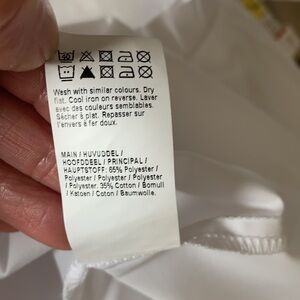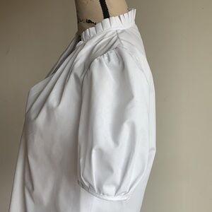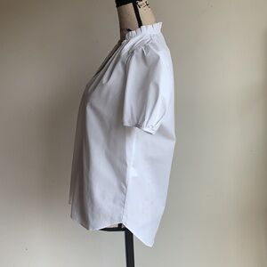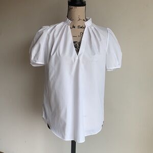 White V-neck pleated collar top. Slight high low hem, short puff sleeves.