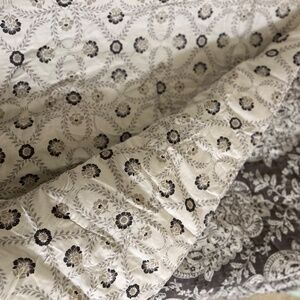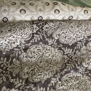 Medium grey damaske print on one side and white and grey floral pattern on the other side. Bought at Kohls, in excellent condition. The tag says full/queen size.