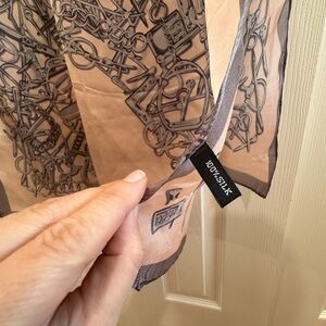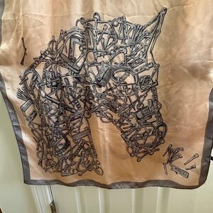 Elegant silk scarf featuring an abstract black design of horse bits in the shape of a horse on a light pink background. Perfect for adding a touch of sophistication to any outfit.