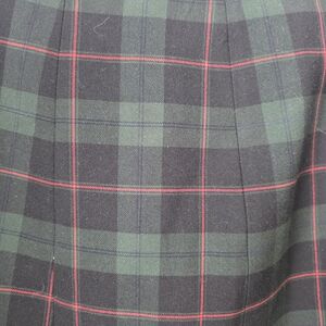 Chic A-line skirt with a tartan pattern. Features dark green and red hues. Ideal for versatile styling.