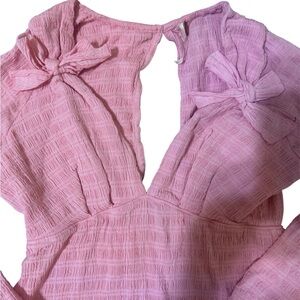 Chic pink dress with long sleeves. Features bow accents. Perfect for stylish outings.