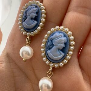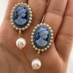 Victoria Vintage GoldColor Blue Cameo Pearl Drop Earrings