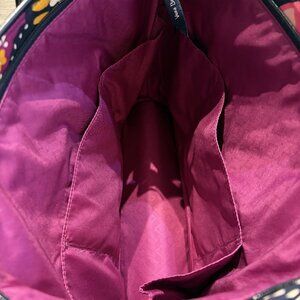 A sophisticated quilted tote featuring a vibrant paisley and floral pattern in navy, pink, red, and yellow. Crafted with leather-like handles and a structured design, this Vera Bradley bag offers both style and functionality for professionals seeking a distinctive accessory. Great for travel or use a diaper bag as well.