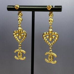 Elegant gold heart drop earrings with sparkling accents. Perfect for adding a touch of glamour to any outfit.