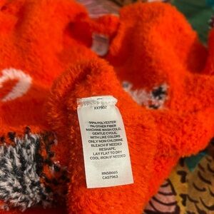 Fuzzy red sweater with a cute cat pattern. Adds charm to any outfit.