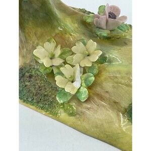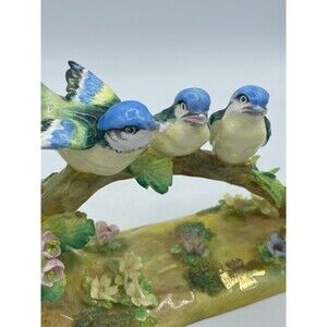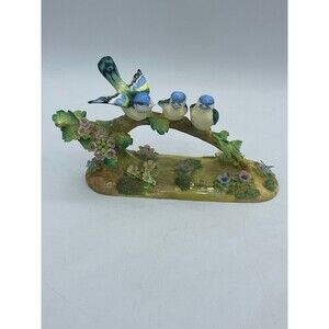 Beautiful figurine with dainty flowers. 3 cute bluebirds perched on a log- one with a worm in its mouth. There are 2 little chips- one on worm and one on yellow flower. These figures are very fragile and can chip easily...overall good preowned condition despite the two chips. Marked TOMTIT 15 on bottom. Nice fine bone china - Staffordshire, England. See all images for more info, closeups, and details.