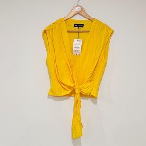 This item is a Zara Knotted Draped Top in a vibrant yellow hue. Brand new with tags. MRSP $45.90