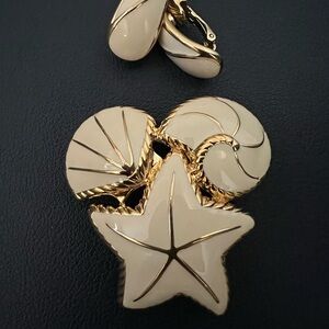 Vintage Trifari Gold and Cream Starfish brooch and clip on earrings Set
