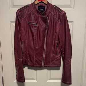 Stylish deep red leather jacket by Mavi. Features sleek design and zippered pockets. Perfect for a bold look.