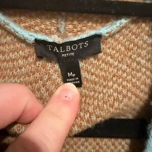 Chic knit sweater with a cozy design. Features a blend of brown and blue tones. Ideal for casual wear.wool blend. Size petite medium. No flaws beautiful condition