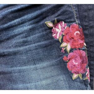 Color: Dark Blue Wash with Red & Pink Embroidered Flowers