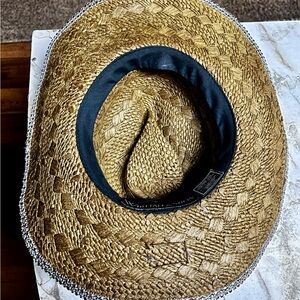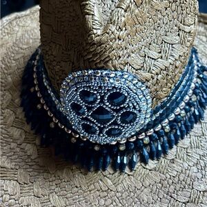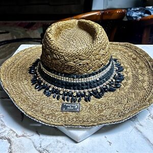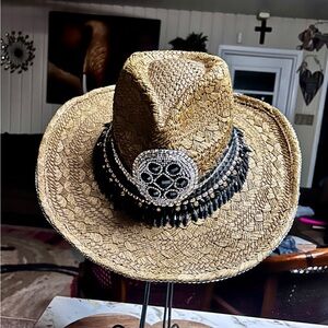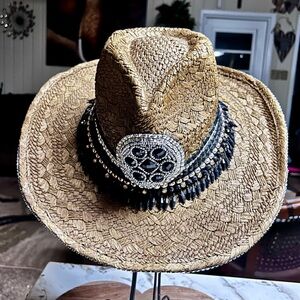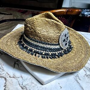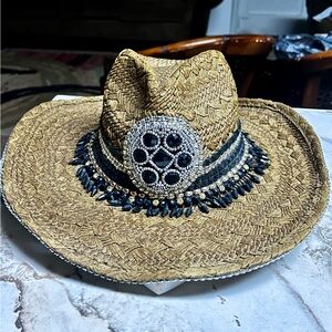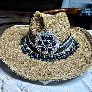 Whittall & Shon ~Brown W/Black & Gold Beaded/Rhinestones Bling Straw Cowboy Hat. The head size is 22.5” inches. The whole size is 15 x 15”. It is handmade 100% paper straw. It has beaded gold & black with silver rhinestones. This hat is in MINT condition & has never been worn.