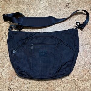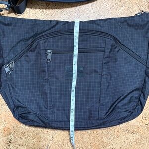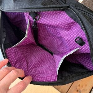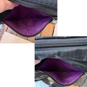 Tom Bihn Parental Unit Diaper Messenger Check Grid Bag In Black With Purple. Meant as a diaper bag, but perfect for day to day.. commuter bag, gym bag, travel. Lots of compartments. Even has an option to zip the middle of the main inside compartment( start the zipper at top and zip downward- took me a bit to figure out). Inside has grab handles. Front & back side curved zip pockets with extra outer small zip pockets. Adjustable strap with moveable strap padding( both can be removed if you want to change out). Key hook inside. Lots of inner o-rings. Black with grey check pattern outer & inside is purple with white check. Durable strong fabric. Made in USA. Great barely used condition( still has a new smell), but I did find some faint marks on smaller outer zip pocket on none label side( see last pic to reference).